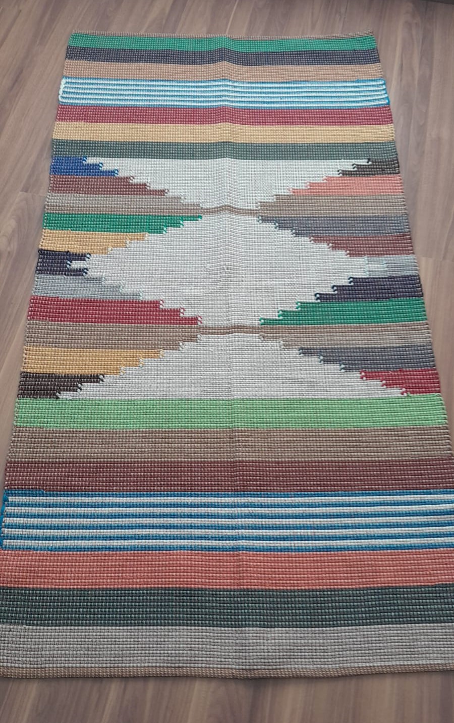 Tapete produzido em tear manual com fio de algodão e acabamento de costura.