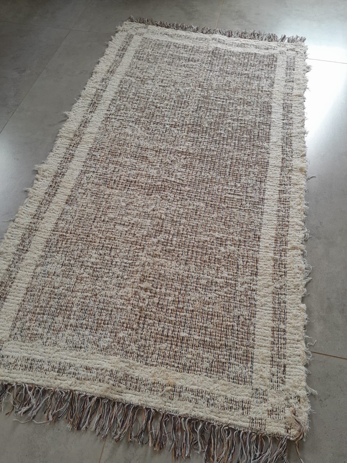 Tapete produzido em tear manual com felpa de algodão e acabamento de franjas no comprimento (amarração manual). Felpudo, com toque super macio, ideal para beirada de cama, hall ou sala. Peça dupla-face, linda e charmosa - de um lado a trama traz a cor, e o outro lado é predominantemente cru com a moldura em cor.